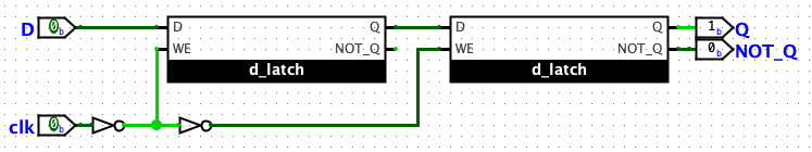 - when the enable is low, then any change to D will be visible on the output of the first latch, but since the enable is reversed for the second, ti isn’t stored in the second one