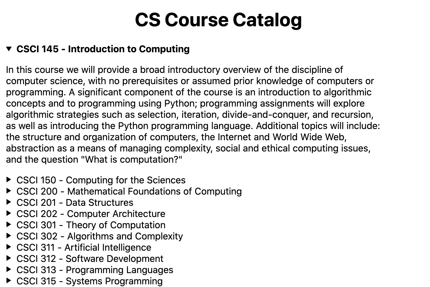 const items = courses.map((course) => (<CourseEntry course={course}/>));When we make a list of React components, it is important that we add a key property so that React can tell which one is which. When React is diffing the virtual DOM and the actual DOM, it needs to have a quick way to tell which component has changed. Without a key, React falls back on simple ordering, and weird things happen if you delete an element out of the middle of a list. The React documentation on lists goes into more detail. The key can be anything, provided it is a unique identifier. In this case, course number will work well (though if we incorporated courses from other departments we would want to use the full name, e.g., “CSCI312”). Note that although key is specified like other props, it is not passed through to the component – it is one of several properties used by React itself.