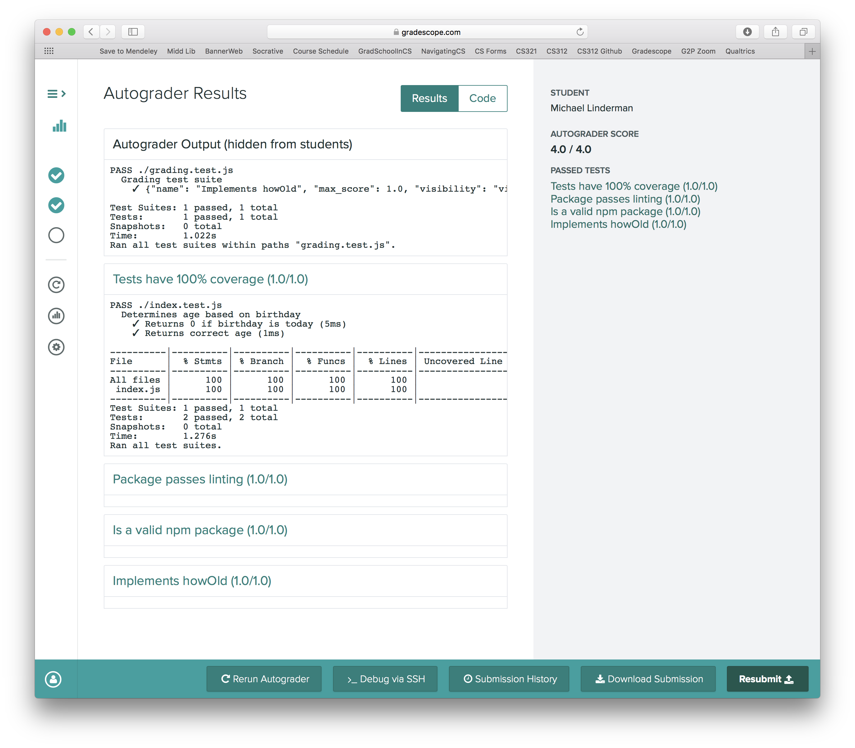 The workflow is detailed below, but in short, after pushing your submission to GitHub, you will submit your repository to Gradescope. Gradescope will run a set of automated tests on your code. You can submit as often as you like with the ultimate aim of passing all of the tests. After the due date, I will read over your submissions, providing feedback, hints and suggestions for revision via line-level comments in Gradescope.