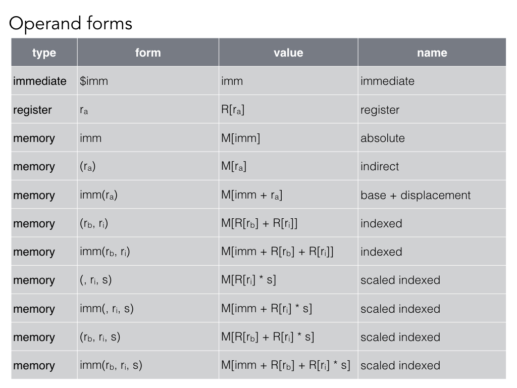 The most important of the memory address schemes to remember is the scaled and indexed with displacement format (imm(Rb, Ri, s)), which is the most general form. All of the others are merely variants of it with one or more of the arguments missing.