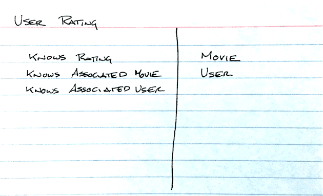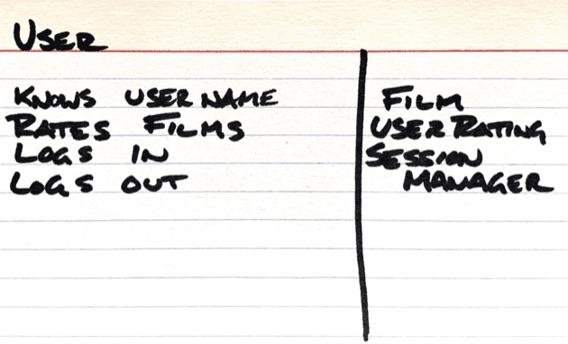 The User will represent the user of the system. This entity has a few more responsibilities. Users can log in and out of the system and rate films. In order to support this, the User needs to collaborate with an entity that represents those ratings, and an entity that will actually check the user's credentials and provide access.