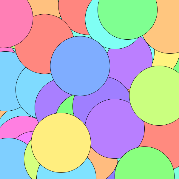 We draw this one circle at a time. On each pass through the draw() function, we pick a random spot on the canvas and we create a circle there. If there is already a circle there, we give up and wait for another iteration. If there isn’t a circle there, we iterate through all other circles and adjust the diameter of the circle so that it is as big as it can be without moving and without intersecting any other circles.