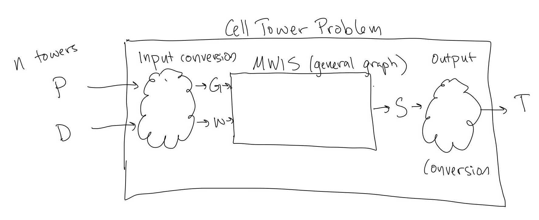 We would like to solve the Cell Tower Transmission Problem using a solver that solves MWIS. To do that, we need to turn the input to the Cell Tower Transmission problem into a MWIS input, and the we need to turn the resulting output from the MWIS solver back into a solution to our original problem. This process of converting one type of problem into another and back again is called a reduction (formal definition in next section). Graphically, this would look like: