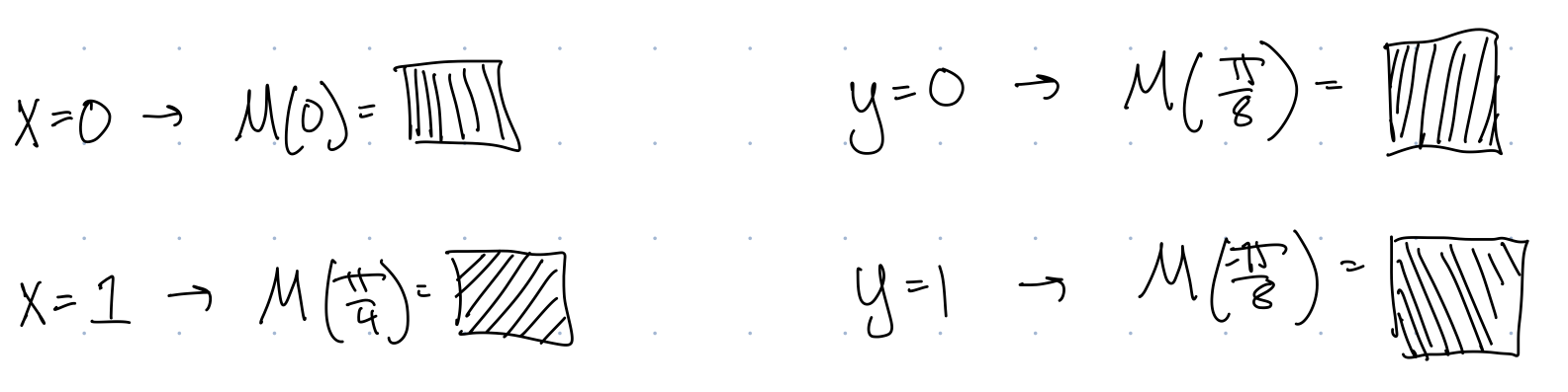 - When \(x\wedge y=0\), we want \(a\oplus b=0\), which happens when \(a=b\), which means we want both photons to either pass through the filters or both get blocked by the filters. If we look at the corresponding polarizers when \(x\wedge y=0\), while they are not exactly aligned, but they are only \(\pi/8\) radians away from being aligned, which is why we get correlated photons with \(85\%\) probability in those cases.