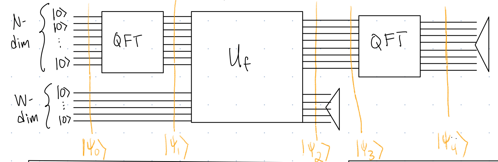 There are two new gates in this circuit, \(QFT\) and \(U_f\), where \(f\) is a function whose range is not \(\{0,1\}.\) Additionally, note that we think of the state of the algorithm as having two parts, an \(N\) dimensional part, and a \(W\) dimensional part.