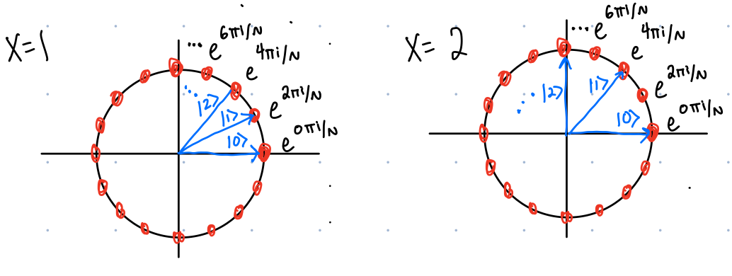 In Figure 4, I show the amplitudes (before dividing by \(\sqrt{N}\)) of the output states when \(QFT\) is applied \(\ket{1}\) and \(ket{2}\). In both the left and the right figures, I have put in red the phases \(e^{0N\pi i/N}, e^{2\pi i/N},e^{4\pi i /N},e^{6\pi i /N},\dots\). In blue I have labeled the kets who have that amplitude. For example, when \(QFT\) is applied to \(\ket{1}\), we get \(\frac{1}{\sqrt{N}}\left(\ket{0}+e^{2\pi i/N}\ket{1}+e^{4\pi i /N}\ket{2}+e^{6\pi i /N}\ket{3},\dots\right)\) and when \(QFT\) is applied to \(\ket{2}\), we get \(\frac{1}{\sqrt{N}}\left(\ket{0}+e^{4\pi i/N}\ket{1}+e^{8\pi i /N}\ket{2},\dots\right)\).