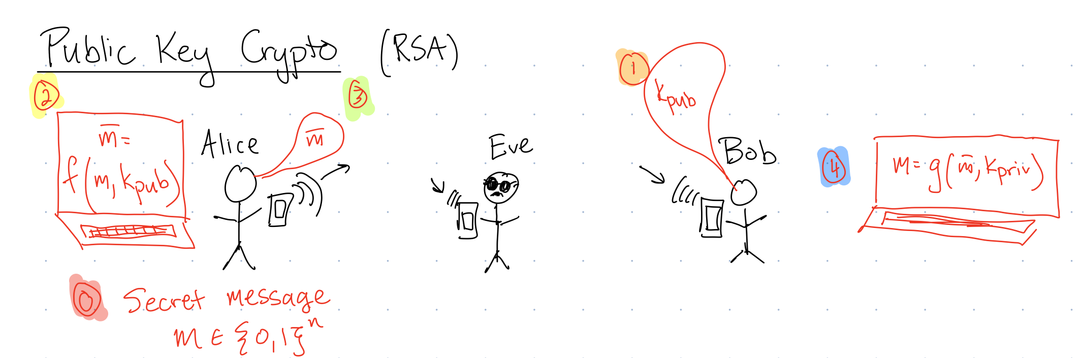 To motivate why we want to create a factoring algorithm, we need to return to our public key crypto system, where Alice wants to send a message \(m\in\{0,1\}^n\) to Bob and doesn’t want Eve to learn the message, even though Eve can learn everything that Alice sends to Bob.